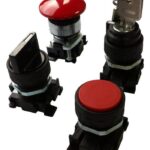 Dispositivo seta enclavable para estaciones de control, presentando switcheo de dispositivos con una perilla giratoria de 55 milímetros.